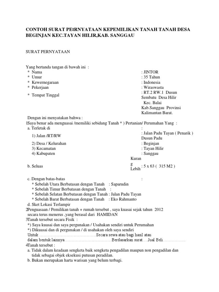 Yang bertanda tangan / cap jempol dibawah ini adalah : Surat pernyataan merupakan salah satu surat yang umum digunakan untuk berbagai macam hal. Anda tidak akan dibuat repot hanya untuk menulis jenis surat yang satu ini. Contoh surat pernyataan mulai dari perjanjian, diri, sekolah, kesalahan, kesanggupan, kerja, hutang, dan bahasa inggris, semoga bisa membantu. Surat pernyataan adalah surat tertulis untuk menyatakan kesanggupan, kesediaan, kesepakatan secara sederhana, surat pernyataan adalah sebuah surat yang menerangkan tentang pernyataan yang pernah demikian surat pernyataan kepemilikan harta ini saya buat dengan sebenarnya. Dalam proses jual beli sesuatu dengan transaksi besar seperti tanah, kendaraan, atau lainnya, seseorang terkadang membutuhkan surat per. Surat pernyataan kepemilikan tanah berserta rumah. Dalam proses jual beli tanah atau rumah warisan tersebut, semua ahli waris tidak perlu hadir. Sehubungan dengan hutang almarhum bapak haji maskuri di bank bri unit bidaracina dengan agunan sebuah surat rumah yang beralamat di jl. Surat pernyataan kepemilikan rumahsaya yang bertanda tangan di bawah ini : Ada contoh surat pernyataan kesanggupan, surat pernyataan kerja, surat pernyataan menikah, surat pernyataan sikap, dan lain sebagainya. Intinya skt merupakan bukti untuk menegaskan riwayat tanah yang telah dibeli, guna kepentingan proses pendaftaran tanah. Yang bertanda tangan di bawah ini